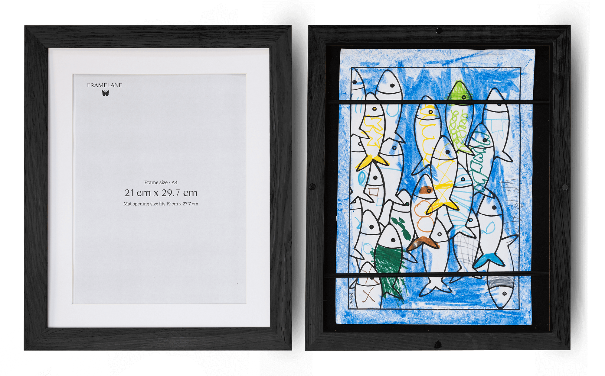Showcase your child's artistic journey with this set of two black oak 21x29.7 cm (A4) kids art frames. These frames are the perfect way to proudly display your little one's masterpieces while keeping all their important documents safe, from paintings, scrapbooks, and schoolwork to documents, certificates, and photos. They also provide convenient storage to organize their past creations in one place.