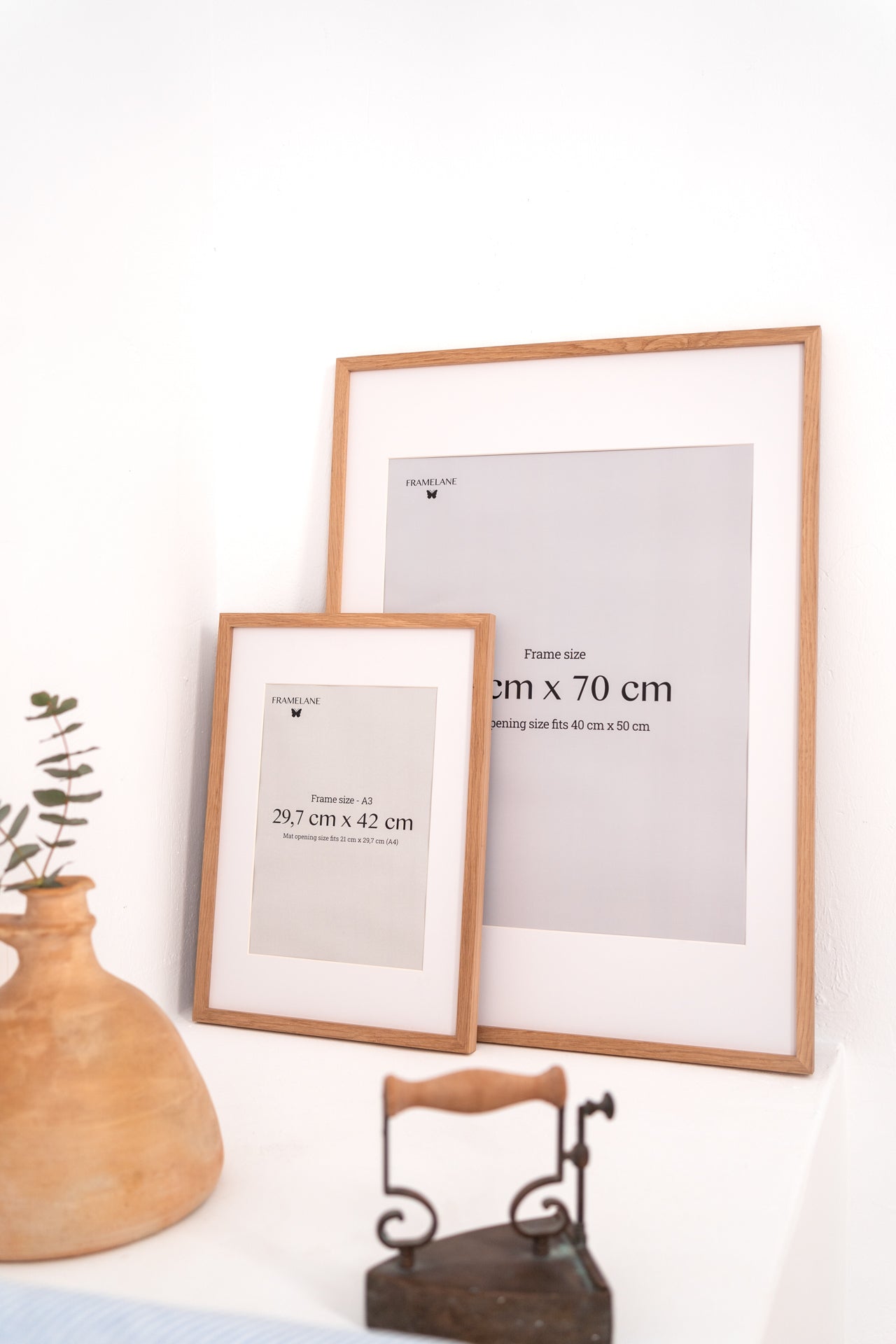 This set of 2 frames is made of 100% natural solid oak wood, meaning that the organic characteristics of the material may cause slight hue changes over time. While we strive to present our products with the utmost precision, we encourage you to embrace the unique charm of our wooden frames and the possible color variations between different batches of the same natural oak wood.