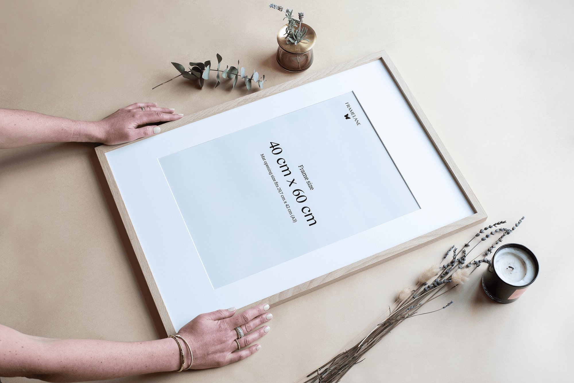 • A removable 29.7x42 cm (A3) white acid-free mat board, also known as a passepartout, that provides two size options while adding a sophisticated touch.